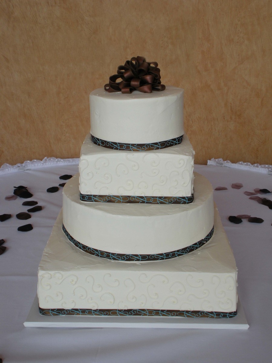 Alternating round and square with ribbon around the bases. Bow was made from fondant. As we were leaving the venue, we saw the photographer pick up the cake table and move it! I nearly had a heart attack, as the table was bowing in the middle! My husband strongly advised him not to pick it up again and helped him slide it back in place.