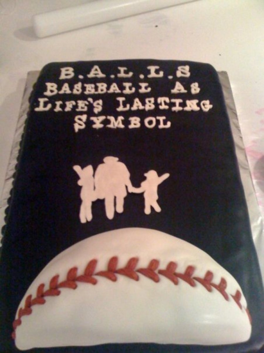 This cake was done for a book launch in NYC. If you look up the book, you'll find it copies the cover. The baseball was done as an additional cake (I used a pyrex bowl) and wrapped it on the side for the author. It's all covered in fondant, lettering and silouette is in white chocolate.