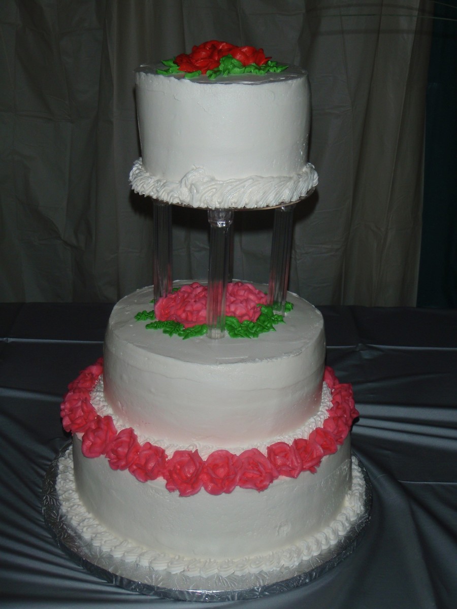 This is my first major cake. A good friend ask me to do a cake for their anniversary. They had never had a wedding cake so they wanted this to resemble a "wedding" cake. It is 12-9-6. All butterceam. Bottom two layers are vanilla with buttercream filling, and the "topper" is strawberry with buttercream. I was so nervous to do this, and then to deliver. Please let me know what you think and what I can do to get better. I have not had any classes, so I would love to hear any opionions. Thanks for looking.