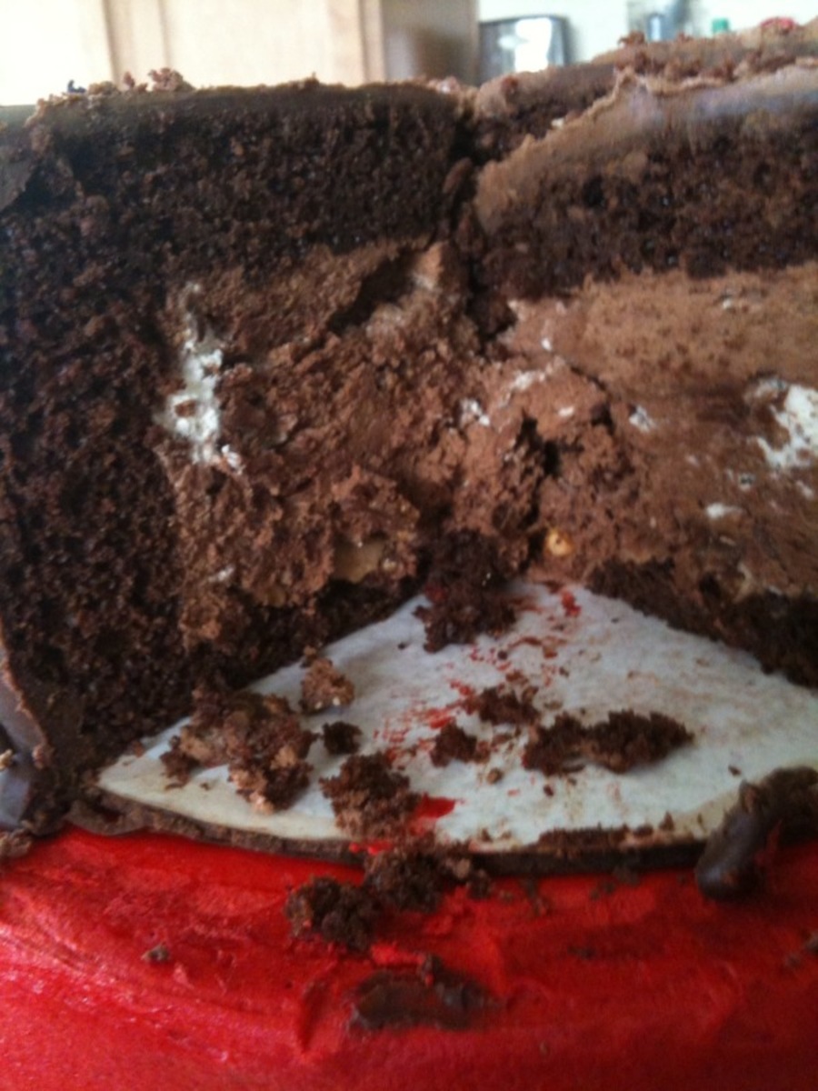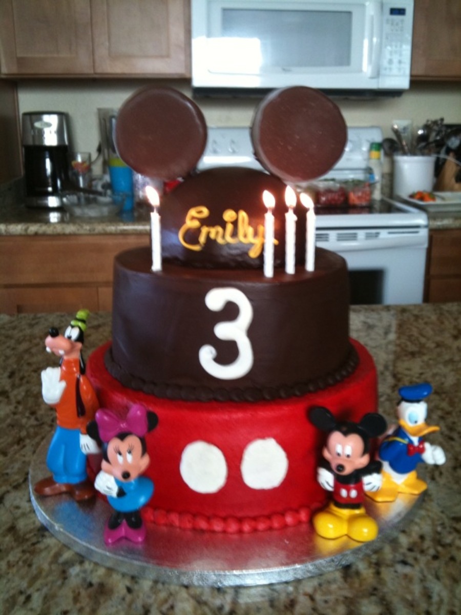 I did this cake for my daughter's 3rd birthday. Cake was all chocolate with ferrero rocher chocolate mousse. The bottom tier was frosted in red colored american buttercream and the second tier was frosted in chocolate ganache. Mickey's head was created using a ball pan and the ears were made from cake that was cut out using round cookie cutters. The ears were frosted with chocolate ganache. The "buttons," "3," and the name inscription were all done with american buttercream. The figures were plastic. 4 candles topped the cake - 3 for her age and 1 more for good luck - our tradition. The second view is the inside of the cake.