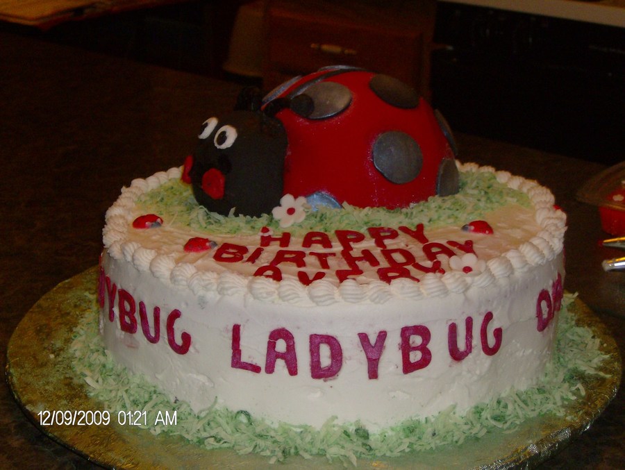 This cake was for my granddaughter 2nd birthday. Ladybug body is made out of cake using Sports Ball pan,and while the head is made out of mini ball. Covered in fondant.