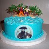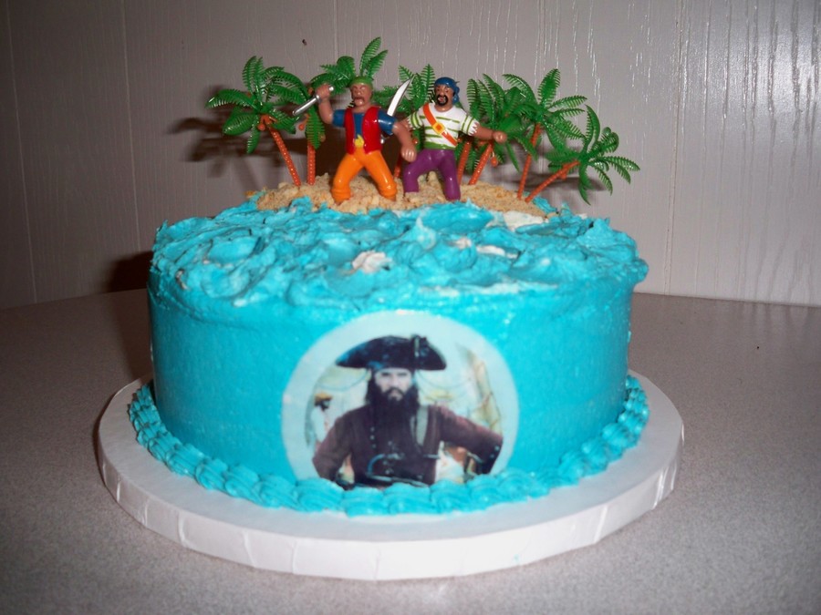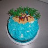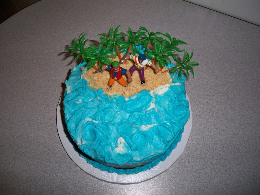 Confetti with b/c. "Island" is covered with vanilla wafers. Pirates was part of a kit. Palm trees added for island effect. I was hoping to find a small chest to place under the trees, but ran out of time.