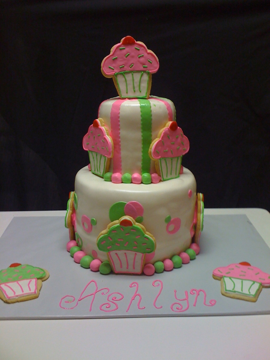 My very very frustrating cake. I had an awesome bow at the top but the rain ruined it. ARGHH!!! The cupcakes are shortbread cookies covered in fondant and royal icing. 10 and 6 inch cakes. TFL!!!