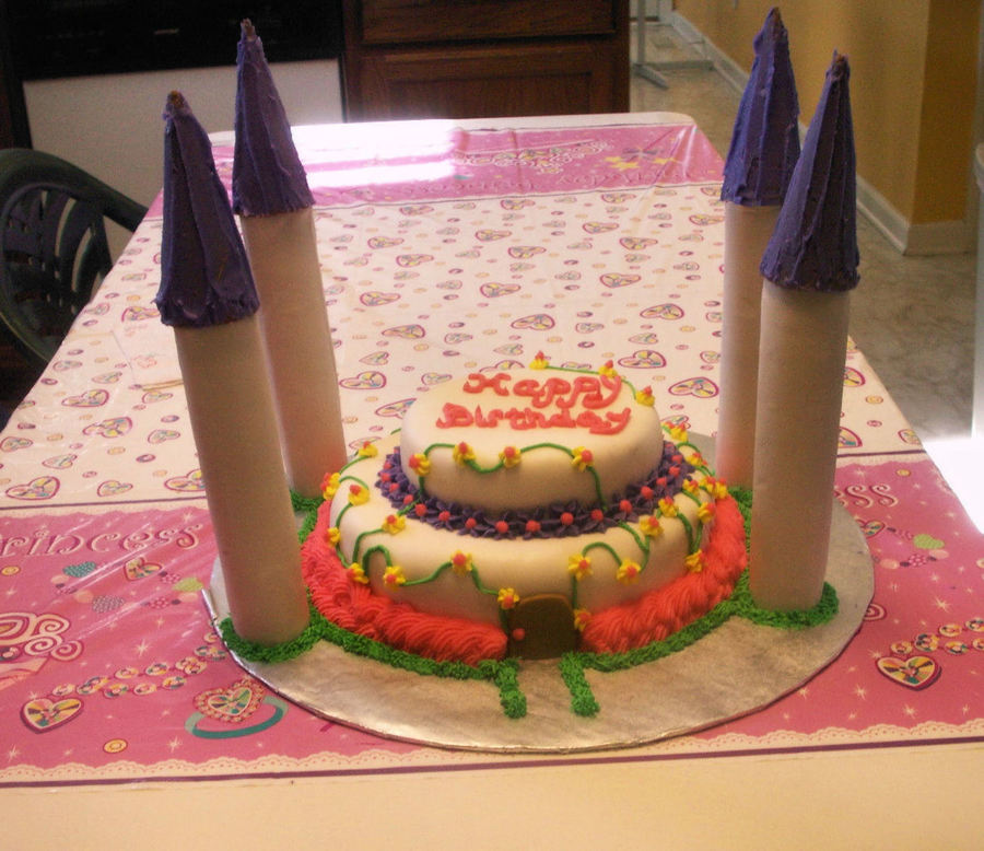 I made this for my daughter who just turned 3. She loves the who princess thing right now so I made her a castle for her bday. It's my first castle cake. I realized after looking at pictures that the towers were WAY to high lol but She still enjoyed it and it tasted great so still a win win. the cake is covered in fondant and icing was buttercreme. I rolled fondant around paper towel cardboard centers and rubbed icing on ice cream cones for tops. I didn't cover them that well but it served the purpose haha