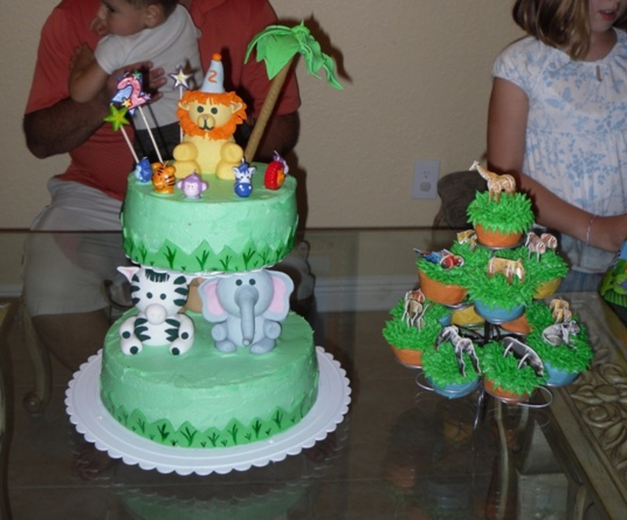 Buttercream cake with decorations in fondant and cupcakes.I took the idea from Wilton.I made the animals and the palm in gumpaste.