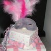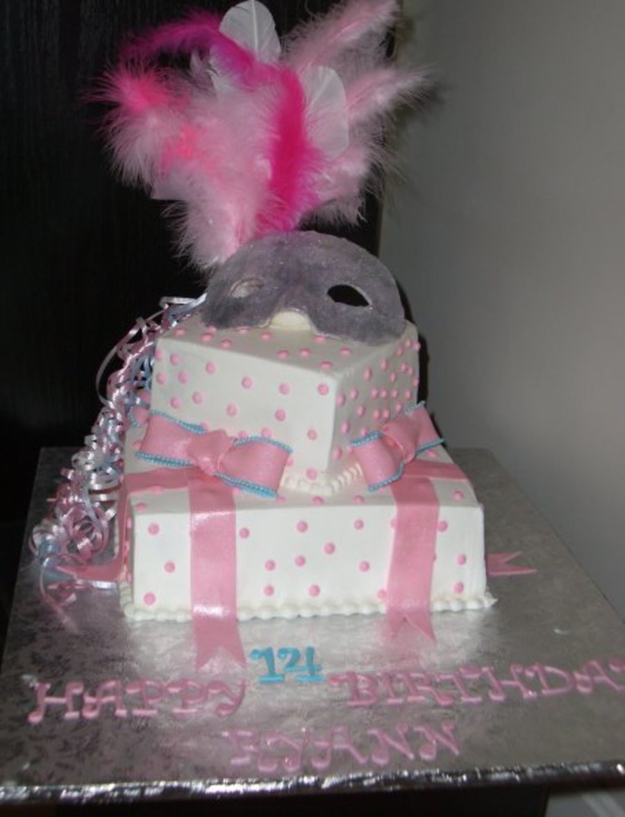Mask made of sugar paste,every thing edible expect the feathers.Marble cake filled with chocolate ganache and iced with vanilla butter cream I got the idea from mamanoke .Thank s for looking