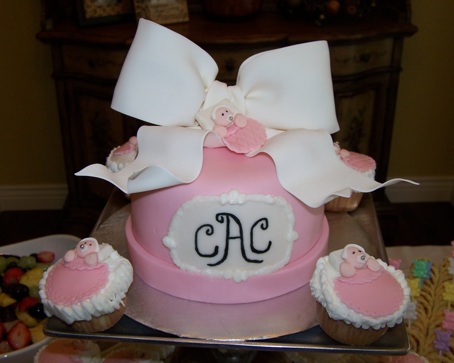 White cupcakes iced with vanilla buttercream. Chocolate cake iced with chocolate buttercream and covered with strawberry fondant. Babies, blankets, bow and monogram are fondant/gumpaste.