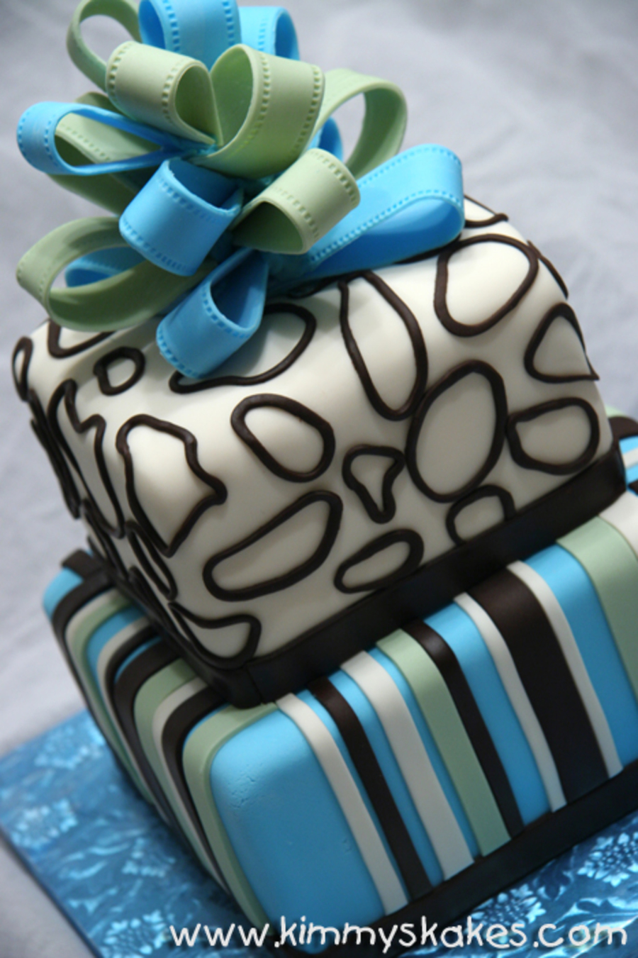This cake is for a baby shower and the design matches the baby's bedding set. 8" & 6" squares covered with fondant and all fondant accents. The bow is gumpaste. :-)