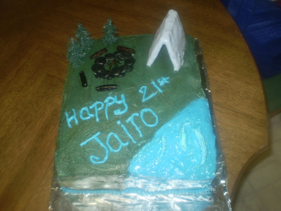Chocolate cake with vanilla pudding filling. tent is made of poptarts and fondant. Stones are made of fondant. the only thing not edible are the trees and fish.