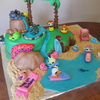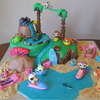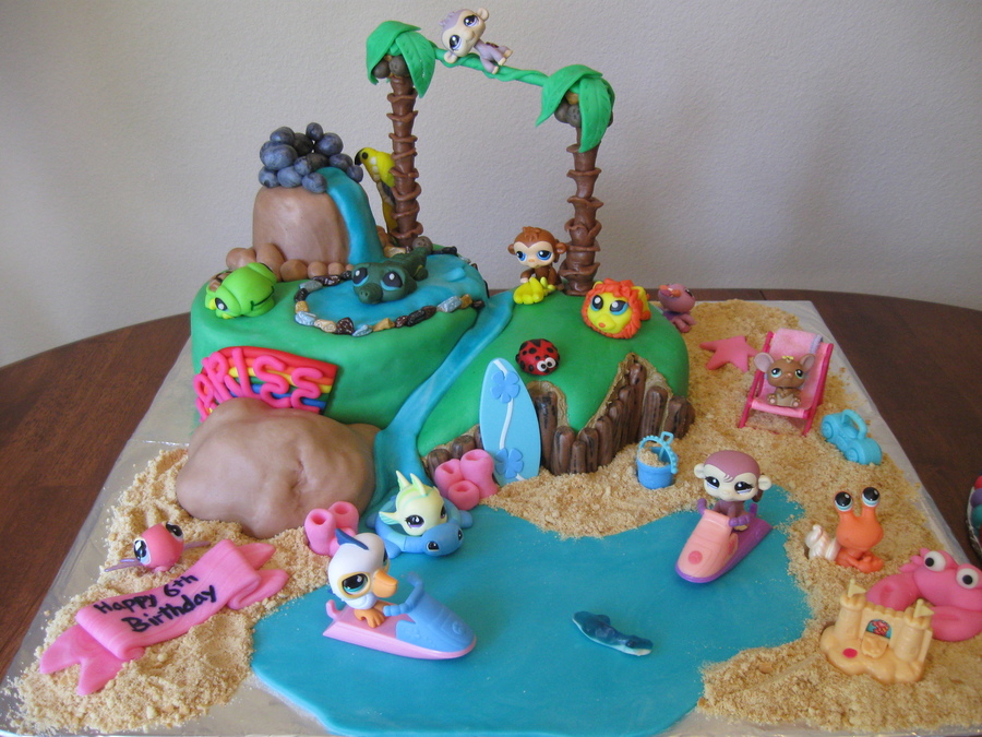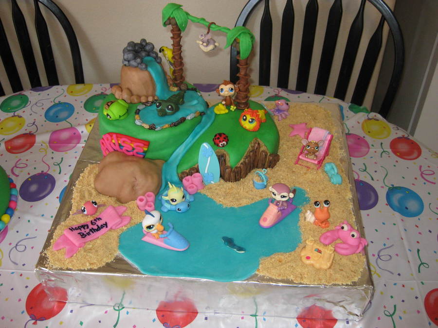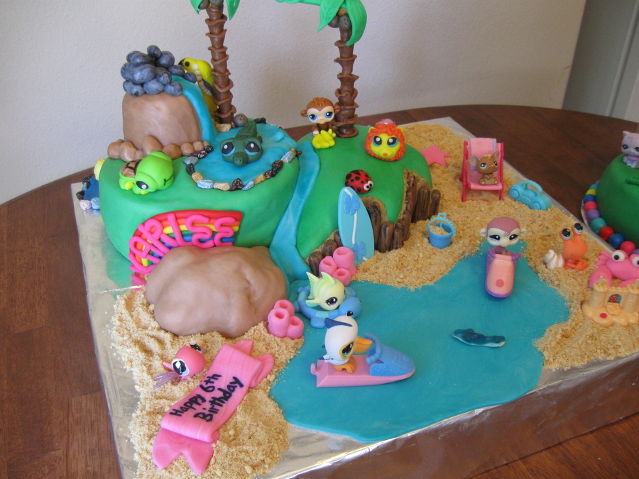 Island Beach Fun cake I made for my daughter's 6th b-day. All of the LPS animals are not edible, except for the alligator, turtle, lion, pink crab & yellow macaw, which were all made with MMF. Thanks for looking!