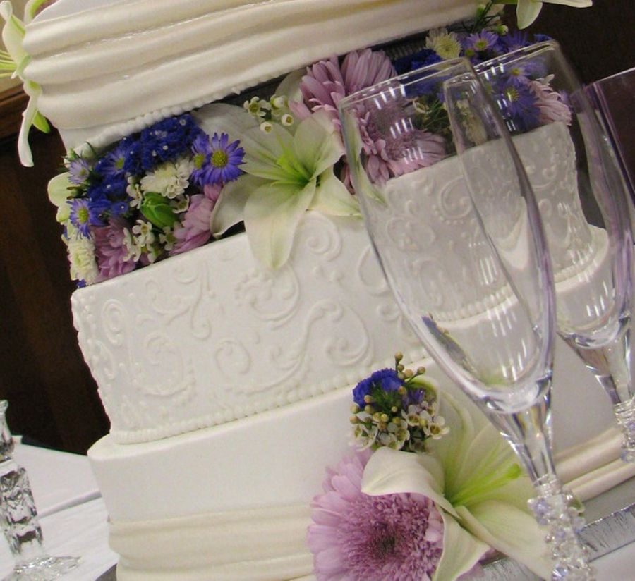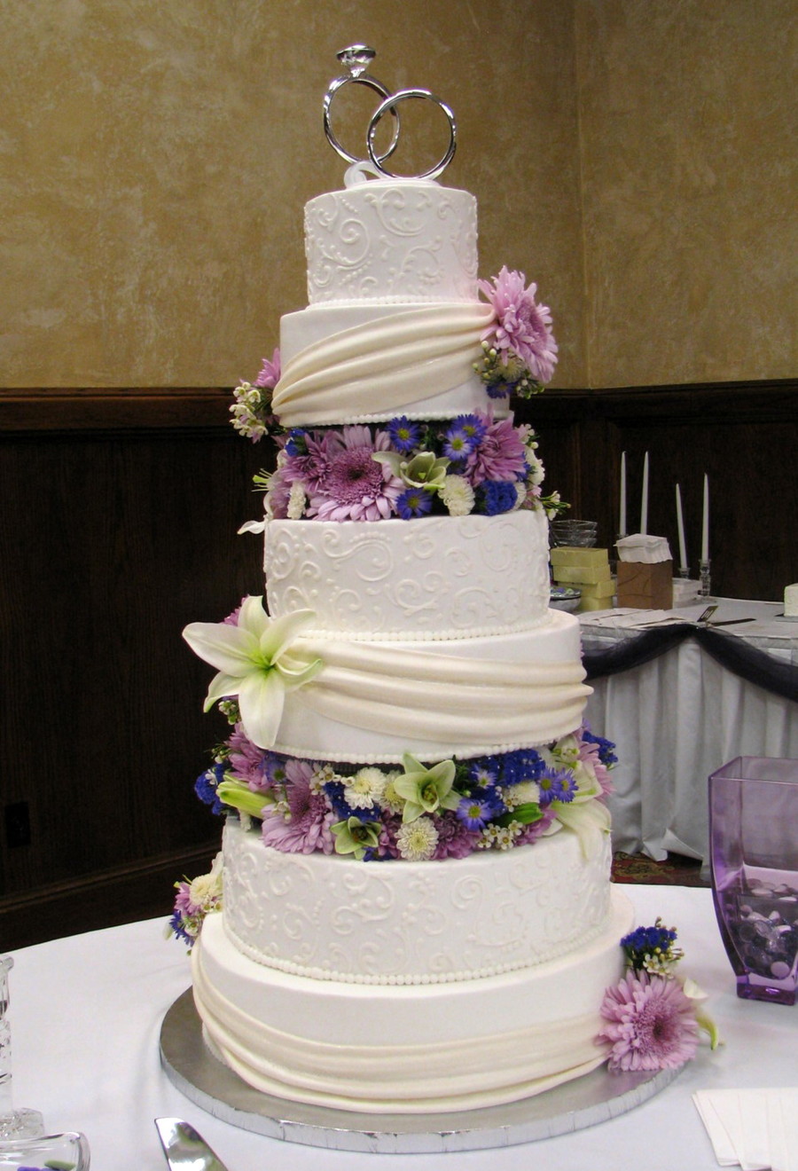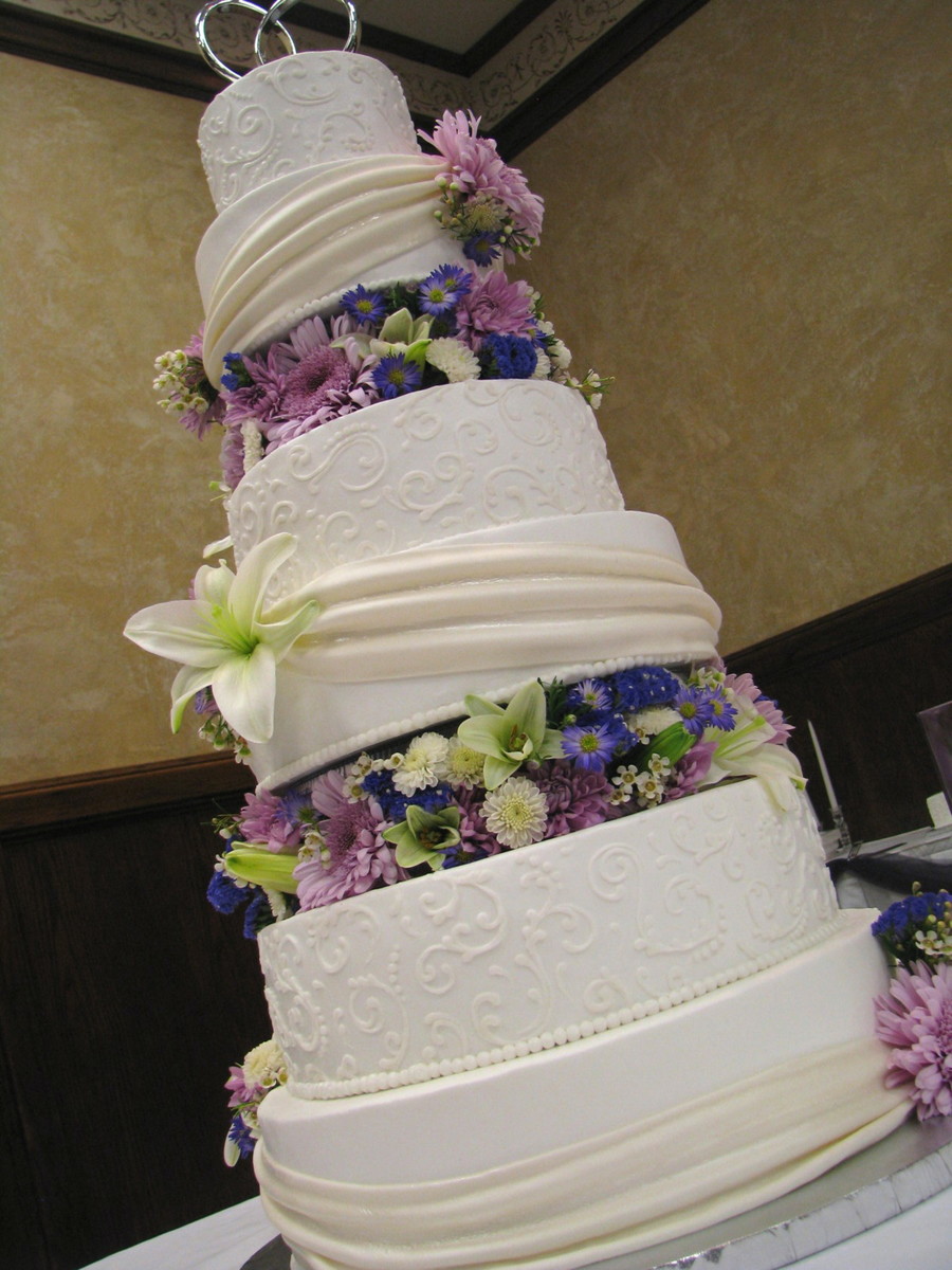 My tallest cake to-date with the separated tiers. The humidity did a number on my swags and they actually did slide down some on the bottom tier because of so much moisture. In the end though the bride was very happy-mission accomplished :)