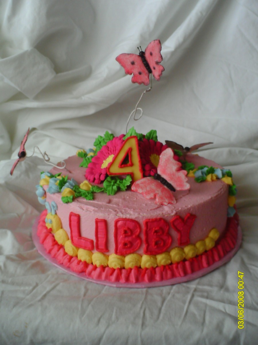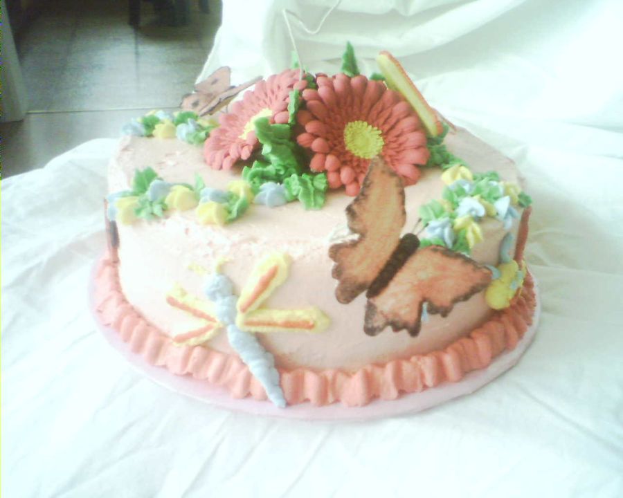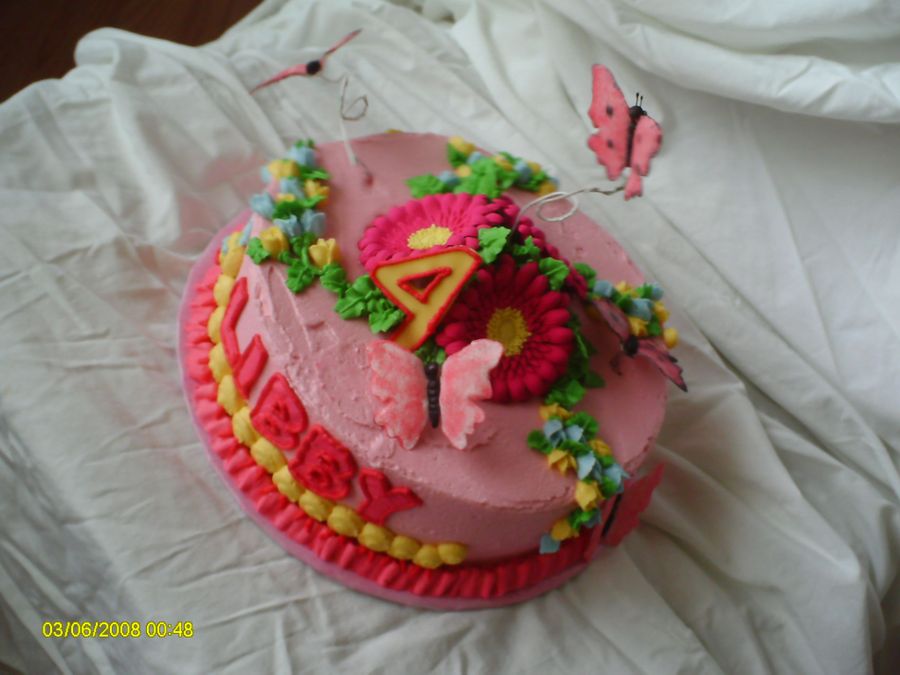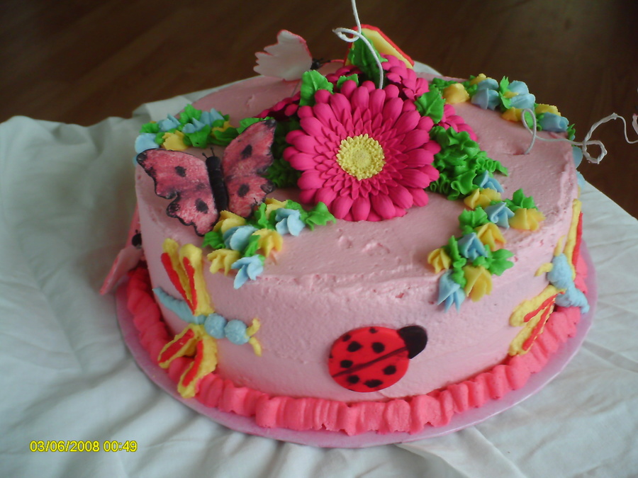Thanks to a CC member for the inspiration! Sorry, I can't remember which one... This cake was supposed to have a second layer on it, but I couldn't find my smaller pan and to make it any larger would have been way too many leftovers. But it's a chocolate cake with bc icing. RI gerbera daisies and SP butterflies. The 4 and ladybug are fondant. I wish I had had some brighter colors for the butterlies, but oh, well. TFL!