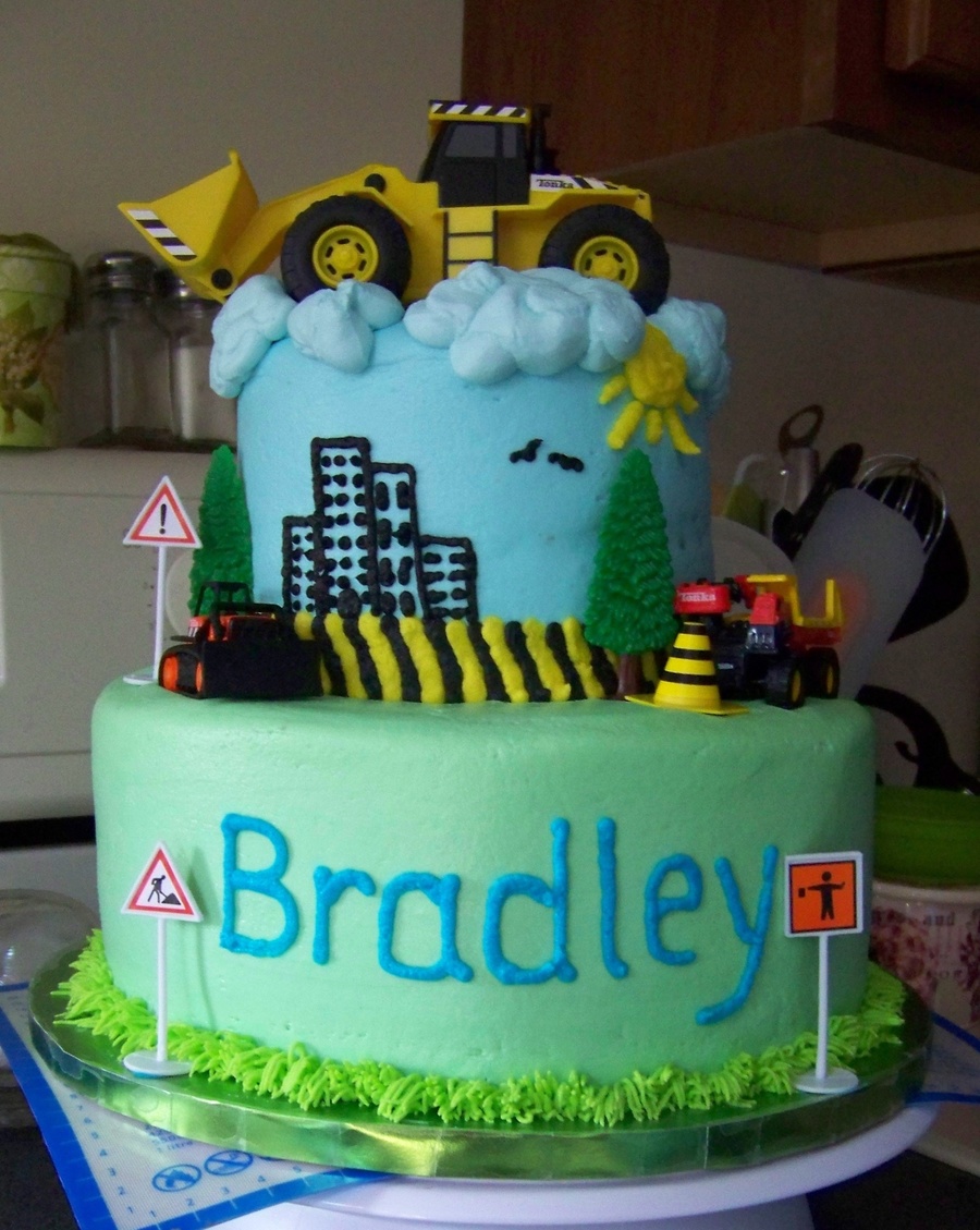 top tier: strawberry cake with sugar cookie middle iced wit vanilla buttercream icing Bottom tier: White cake with sugar cookie middle and iced with vanilla buttercream icing. All trucks, cones, signs and tree are toys provided by the customer