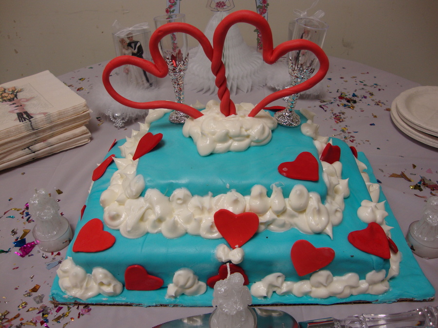 my first decorated cake! I made the MMF and dyed it too! buttercream clouds and fondant hearts. Sour cream chocolate cake with Peanut butter mousse and Peanut buttercream