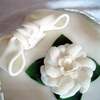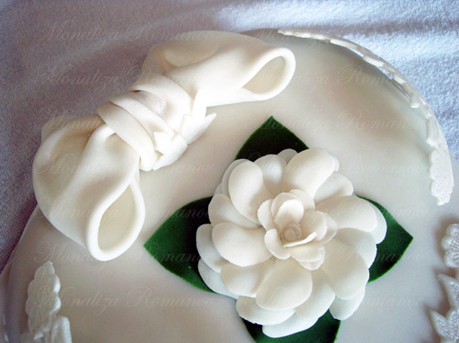 11" heart shaped cake made from five layers of different types of cakes and chocolate filling.The cake is covered in fondant and the lace pieces, bow and flower are made in gum paste. Inspired by Kerry Vincent. TFL.