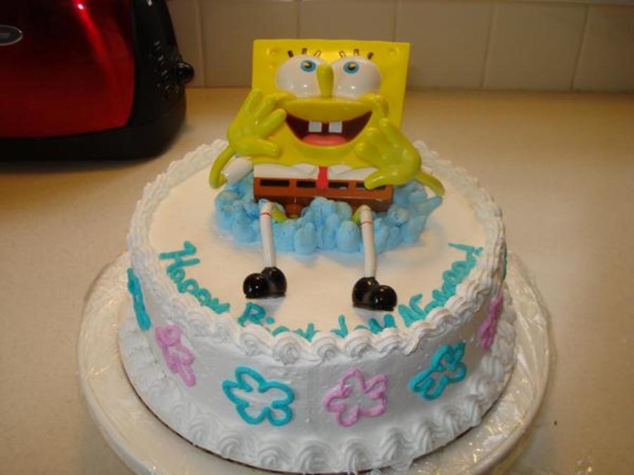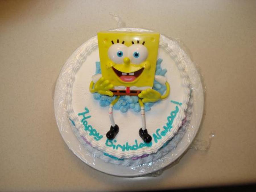 This cake was done super quick on short notice and was used for a smash cake for a childs 2nd birthday. Icing is whipped cream icing, and spongebob is a plastic bendable toy.