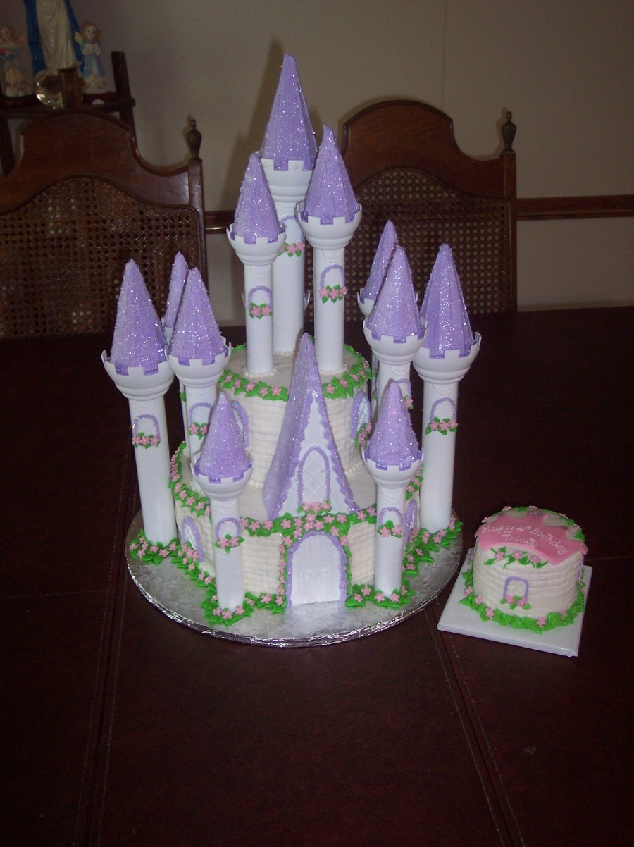 Birthday cake for 1 year old using Wilton's castle. Lots of fun. Smash cake is 4" round. All cake is french vanilla with bc icing. Flowers are royal icing.