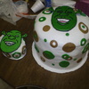 three layered cake with different fillings in each layer. covered in fondant. and topped off with a colorflow shrek face. made a personal size replica for the birthday baby. my family seen a photo of this cake and wanted a replica of it for the baby, i think i did a pretty good job. there are some areas i could have done better.