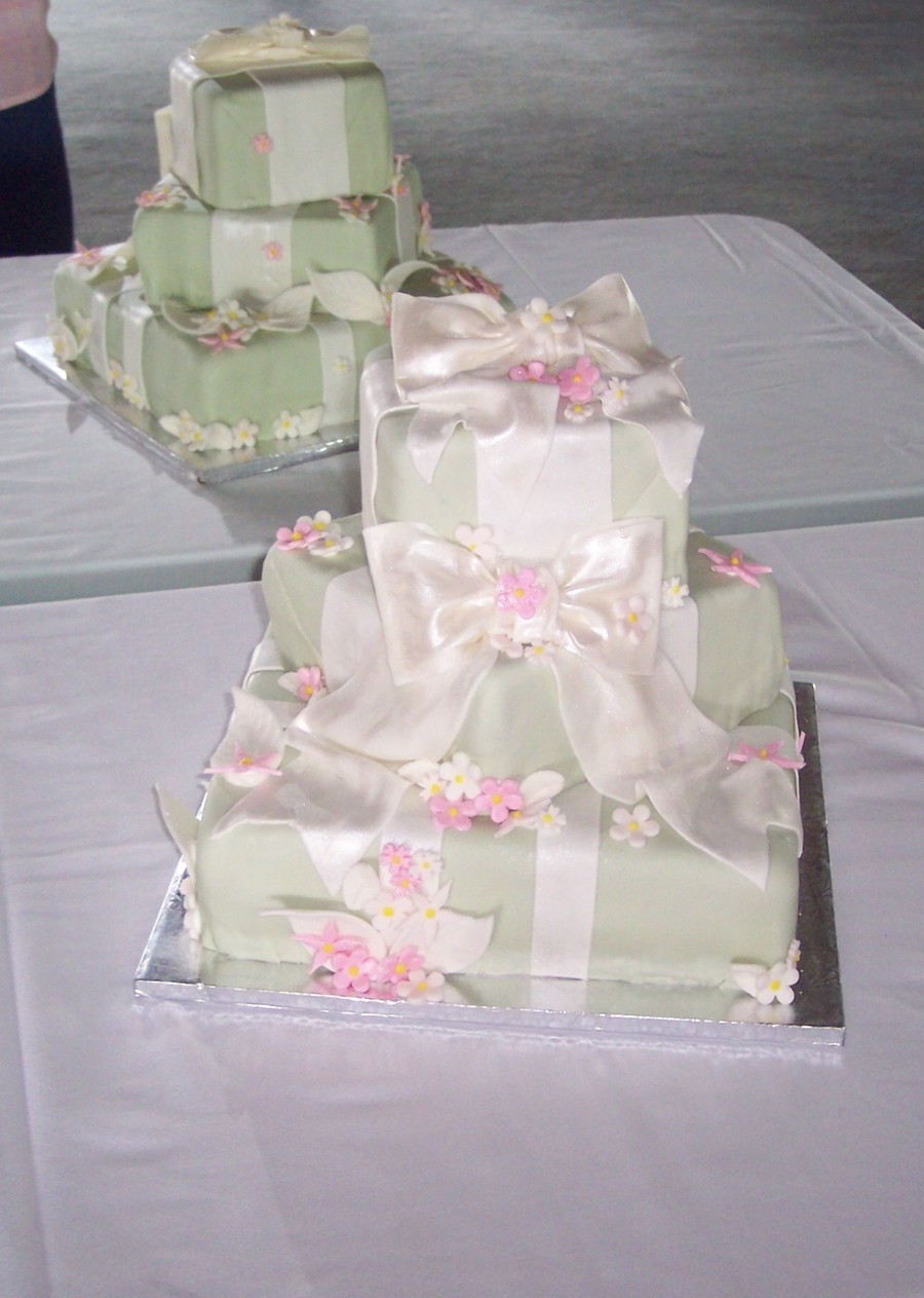 Square vanilla filled with bc, cakes covered with mmf, with mmf ribbons, bows and flowers.
