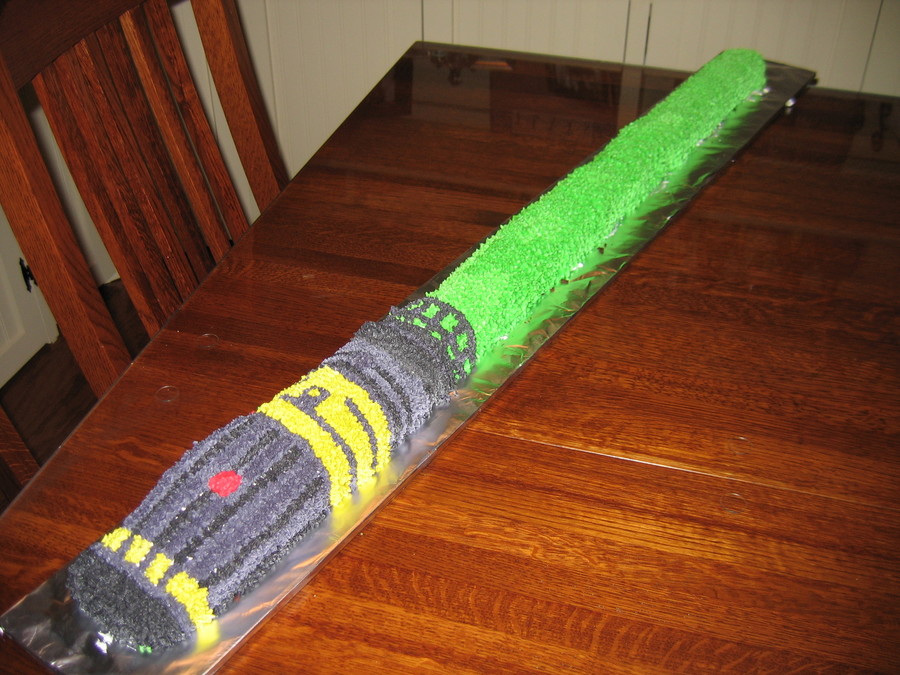 Buttercream covered light saber. I made this by baking the cake in an 8.5x11 cake pan. I cut it into strips, one being slightly thicker than the others, for the handle. I had to do a little carving to get it to taper nicely. I also had to go buy a 1" x 6' board to lay it on. I had my son's toy light saber on the table for inspiration.