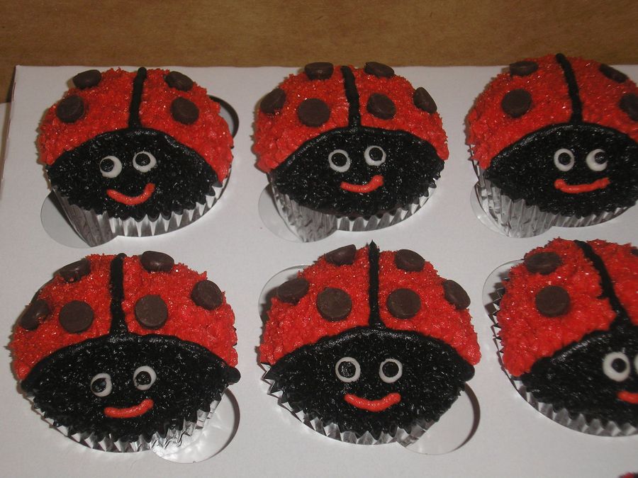 2 dozen ladybug cupcakes, buttercream with red sprinkles and chocolate chip spots.
