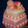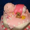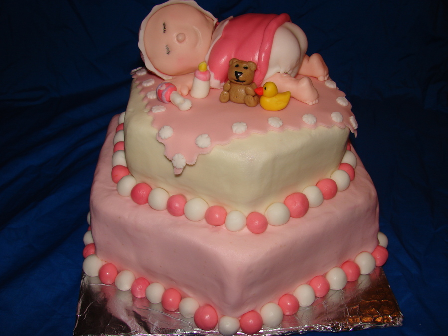 the baby was made out of pound cake the clothes ,toys ,bottle,balls and blanket are fondant. the bottom layers French vanilla cake covered with BC