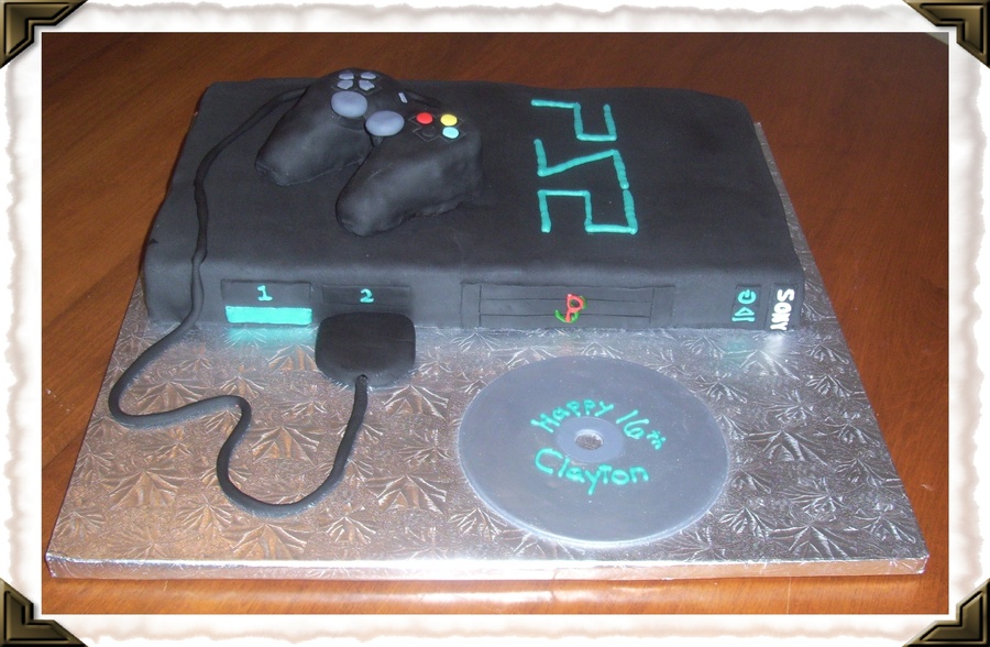 My husband and I made this PS2 cake for a family member's birthday. The carved chocoate cake is covered in fondant. The controller underneath is made from crispy rice treats. And the game CD is a fondant circle cut out that is dusted with metalic silver luster dust.