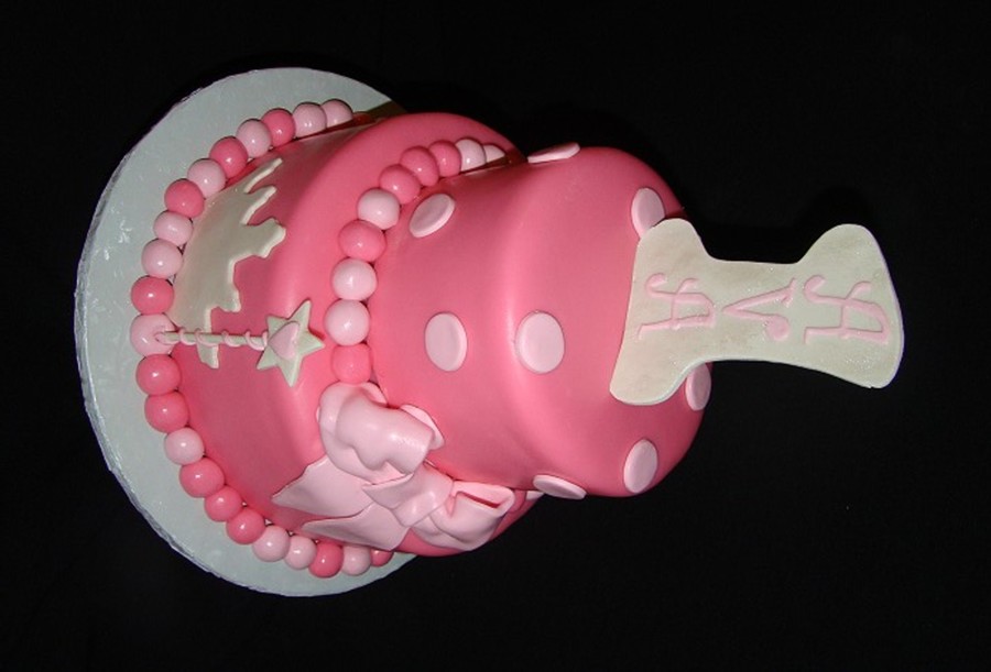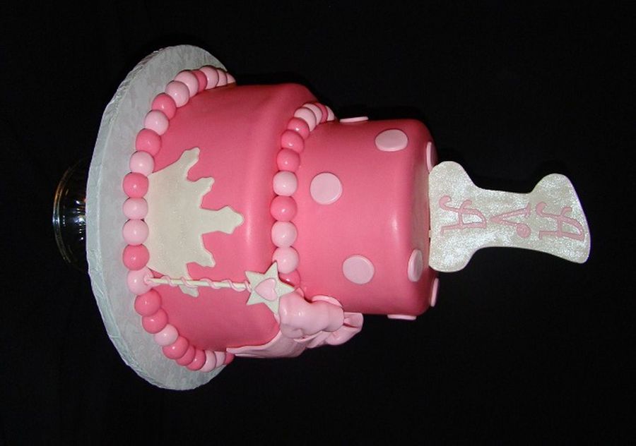 This was a lot of fun! 9" double layer bottom and 6" double layer top. Covered in MMF. Crown is MMF, bow is MMF, #1 is gumpaste. Funky tappits for the name. Wand is a lollipop stick with a gumpaste star. #1 and crown are dusted with super pearl.