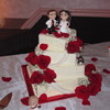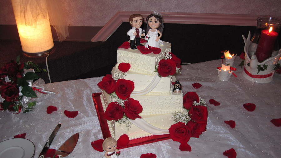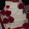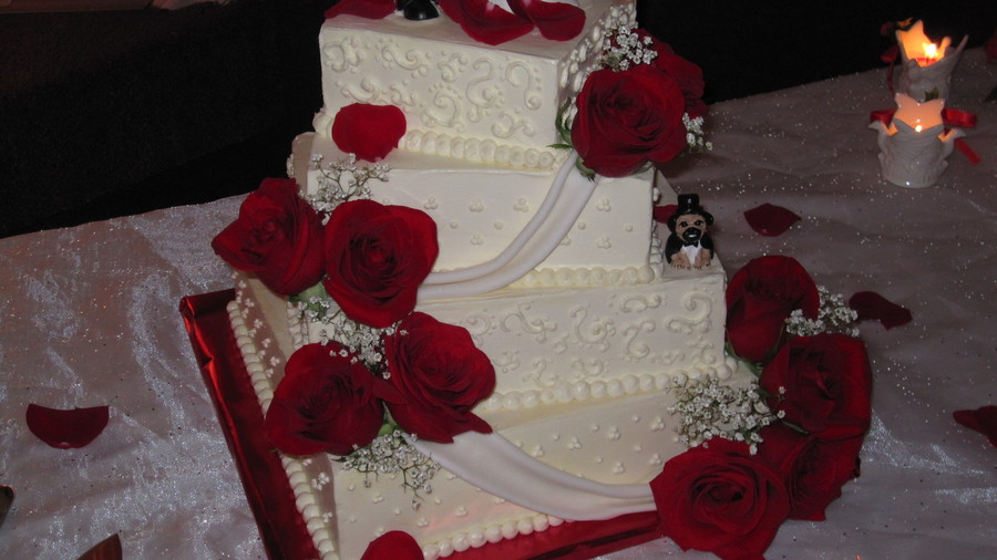 butter cake with strawberry filling and white chocolate cream cheese buttercream. buttercream scrolls and dots. swags made of mmf.