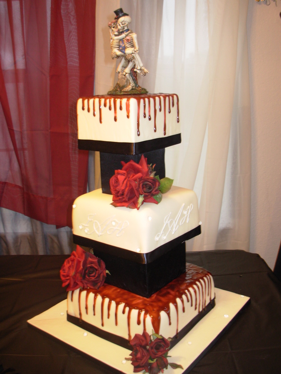 Designed by the bride. She wanted dripping blood that was dark red, and a monogram with "bling". Fondant with piping gel "blood" and sugar diamond "bling"