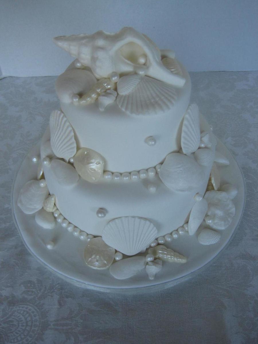 All white Sea shell wedding cake. Shells are fondant, sand dollars are chocolate.