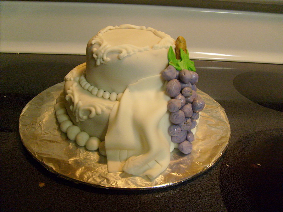 I made this for a friend who said she wanted a birthday cake that kinda looked like a wedding cake. It is covered with fondant. the kerchief, grapes, and appliques are also made from fondant.
