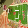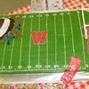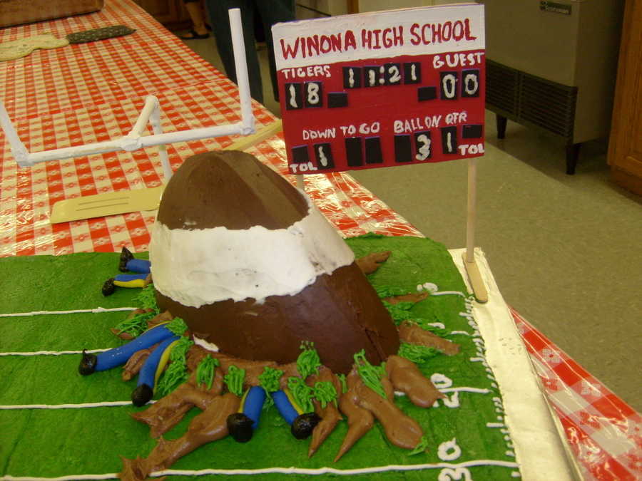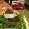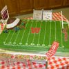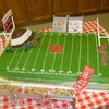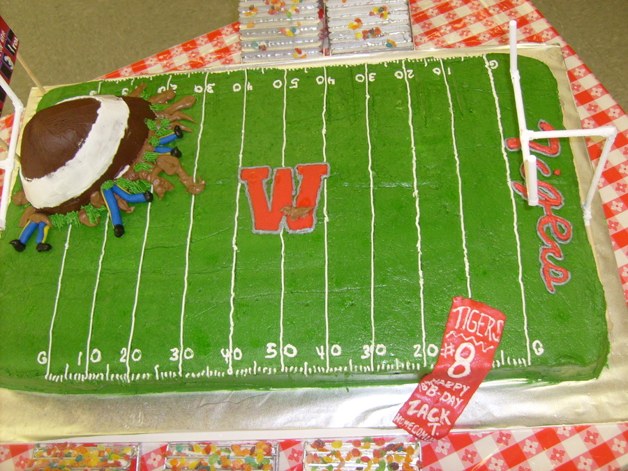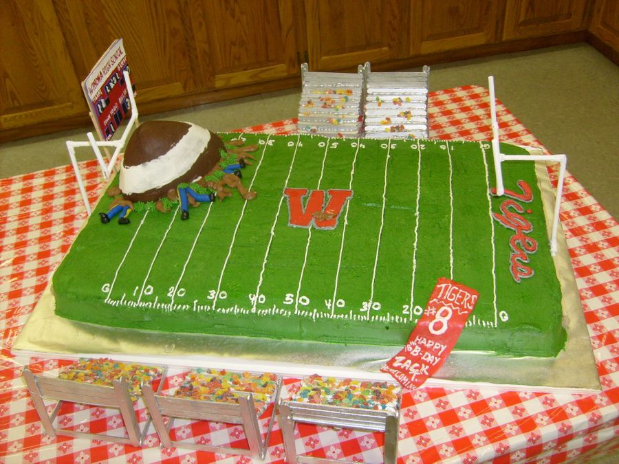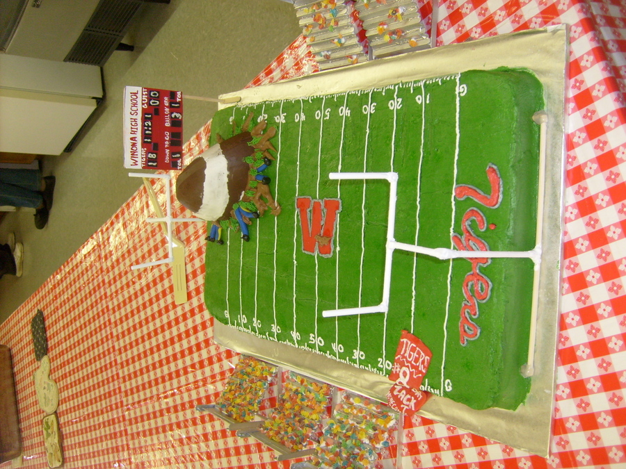 16" X 28" classic white with hmbc icing. football was classic white cake with hm choc bc icing, mud hmbc icing. legs under football are fondant, field goals dowel rods with glue gun and spainted white. scoreboard craft materials, can be reused if desired. bleechers - popcicle sticks hot glued. fans are fruity pebbles attached with white bc icing
