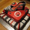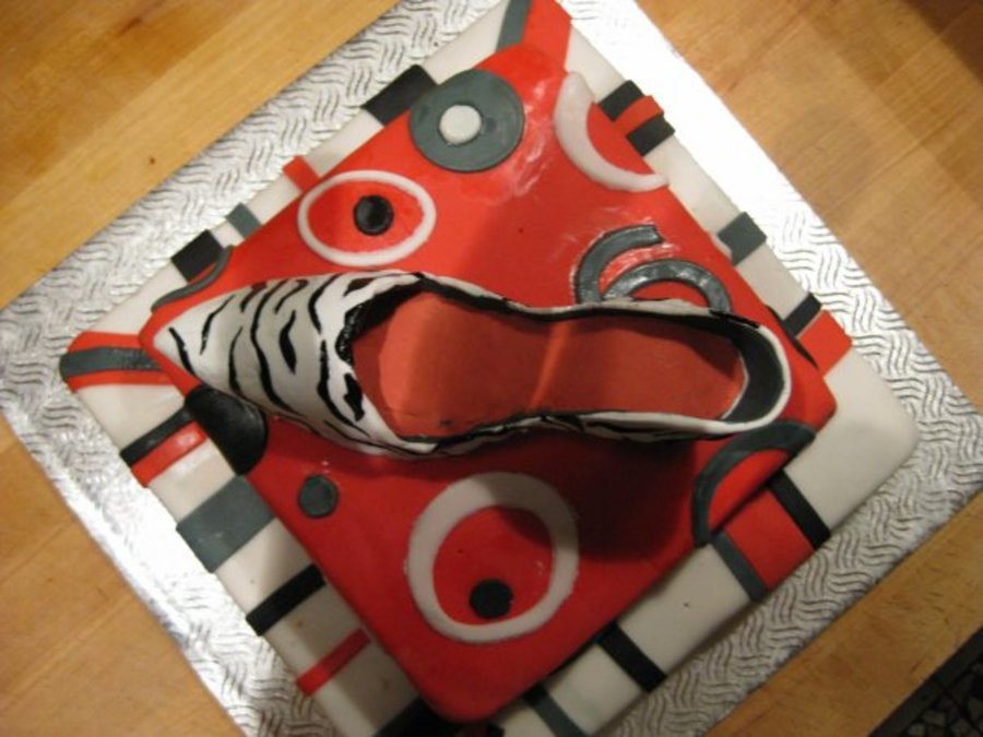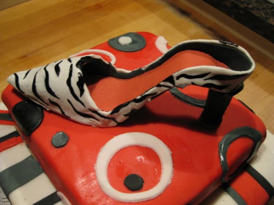 This is my first time making a shoe. Gumpaste shoe, painted on teh sebra stripes, and fondant covered cake.