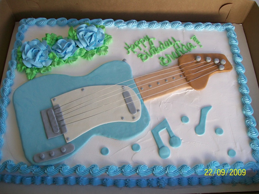 Customers idea of having it this way I hope it turned out. I wasn't too sure of the guitar it might be missing a few things but was working on memory, didn't have a picture to copy. Sorry. Tres leches cake with whipped cream and fondant guitar (on cake board).