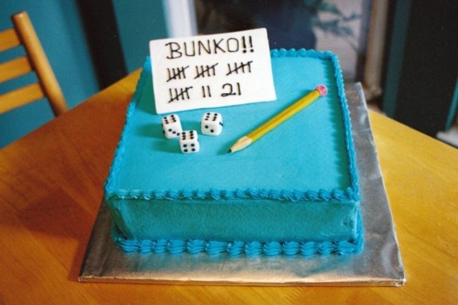 Cake for a Bunko Party - scorecard, dice and pencil made out of fondant. Iced in Buttercream.