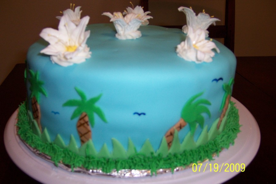 I made this cake for a luau party. It is covered with fondant with royal icing flowers on top. Thanks for looking