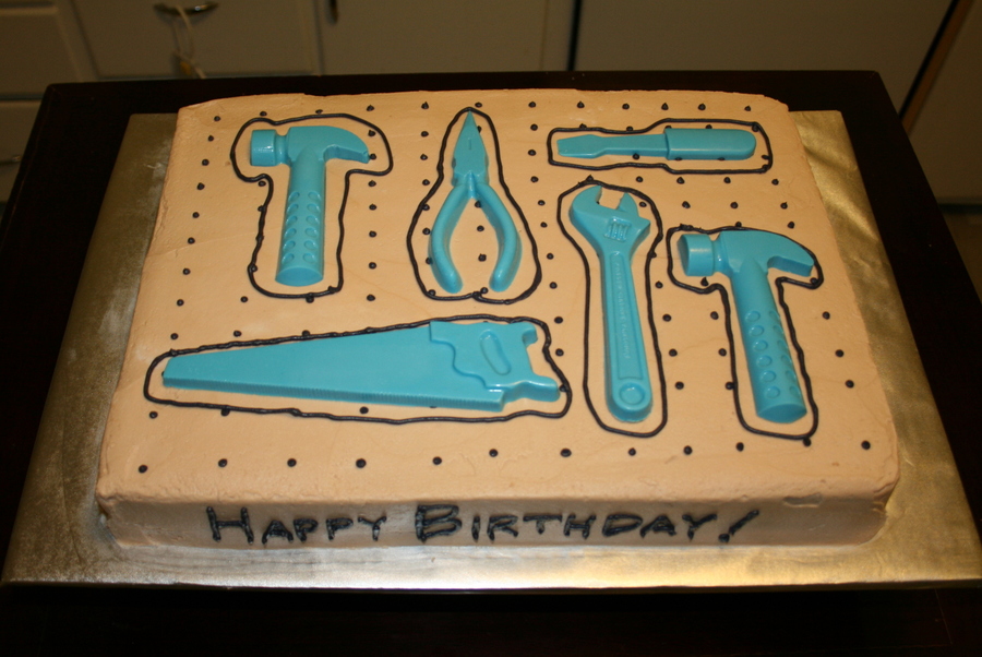 This cake was a French Vanilla cake with buttercream frosting and chocolate tool decorations. The design was inspired by kakesbykitty. I wanted to add the silver accents but couldn't find the right product. Oh well the little birthday boy, Nate, still loved it! :)