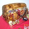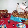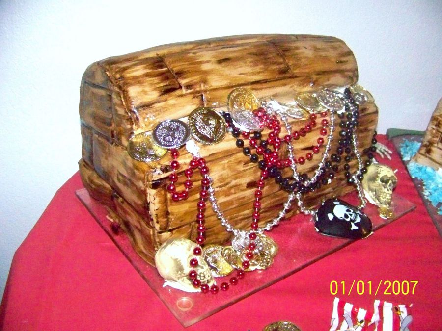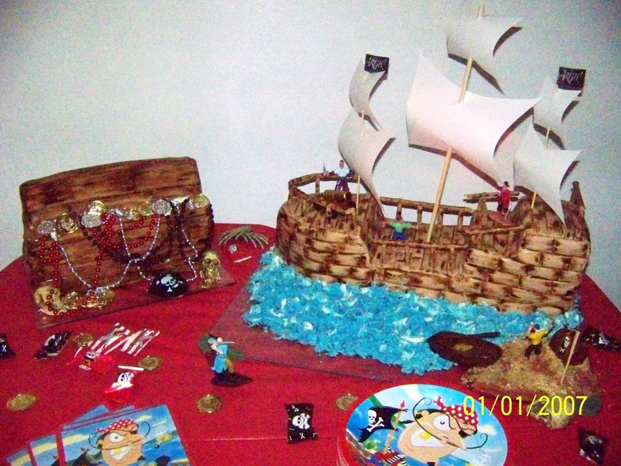 Sculpted treasure chest and pirate ship cake covered with marshmallow fondant.