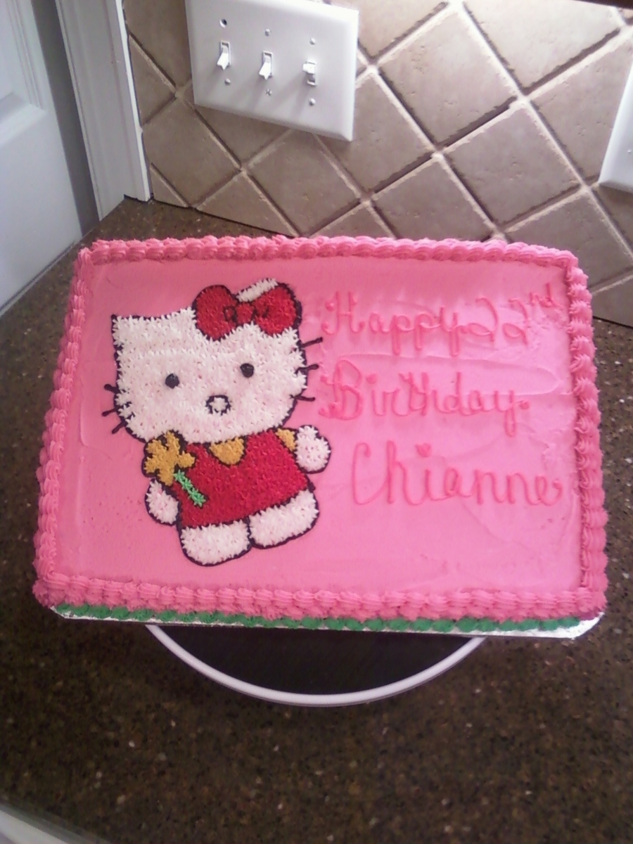 Red Velvet cake w/ buttercream icing. The "Hello Kitty" is free handed.