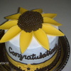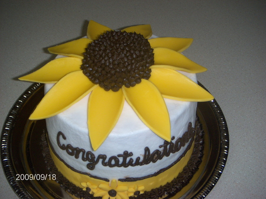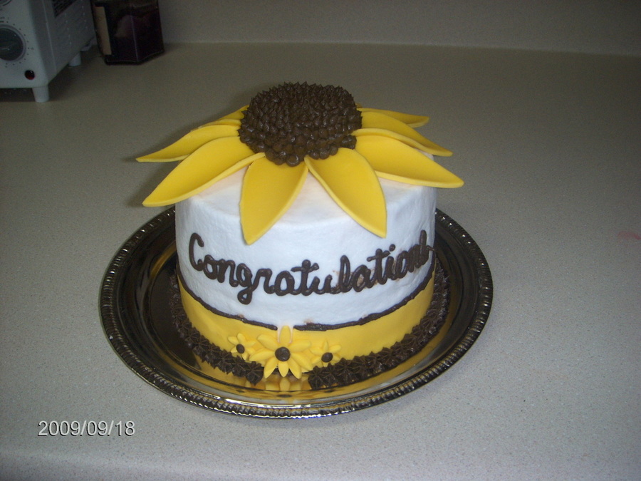 My friend wanted me to make her a sunflower cake, and she was getting married so I found this idea on here and tried to recreate it with some additions. Unfortunantly I was writing congratulations, and wrote CONGRATIONS! lol! It stained the BC and when I was trying to fix it I smudged the lines as you can see!! I tried to cover it up, but it just wasn't happening!! Not very happy about that, but she did like it. It's a 6" round, iced w/BC and fondant decorations! TFL!
