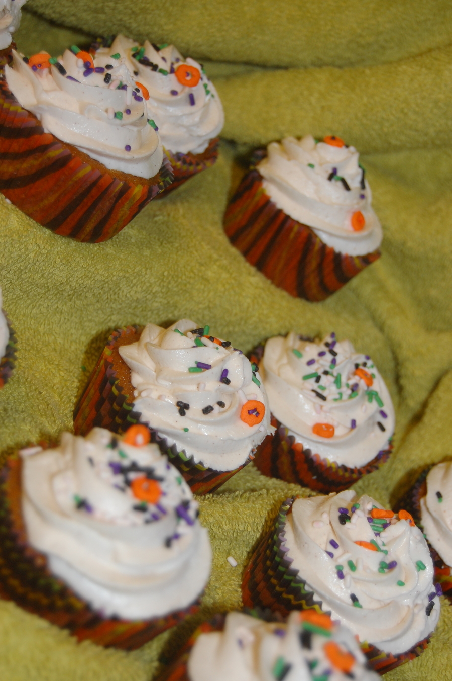 Pumpkin cupcakes with Apple Spice Buttercream icing and sprinkles.