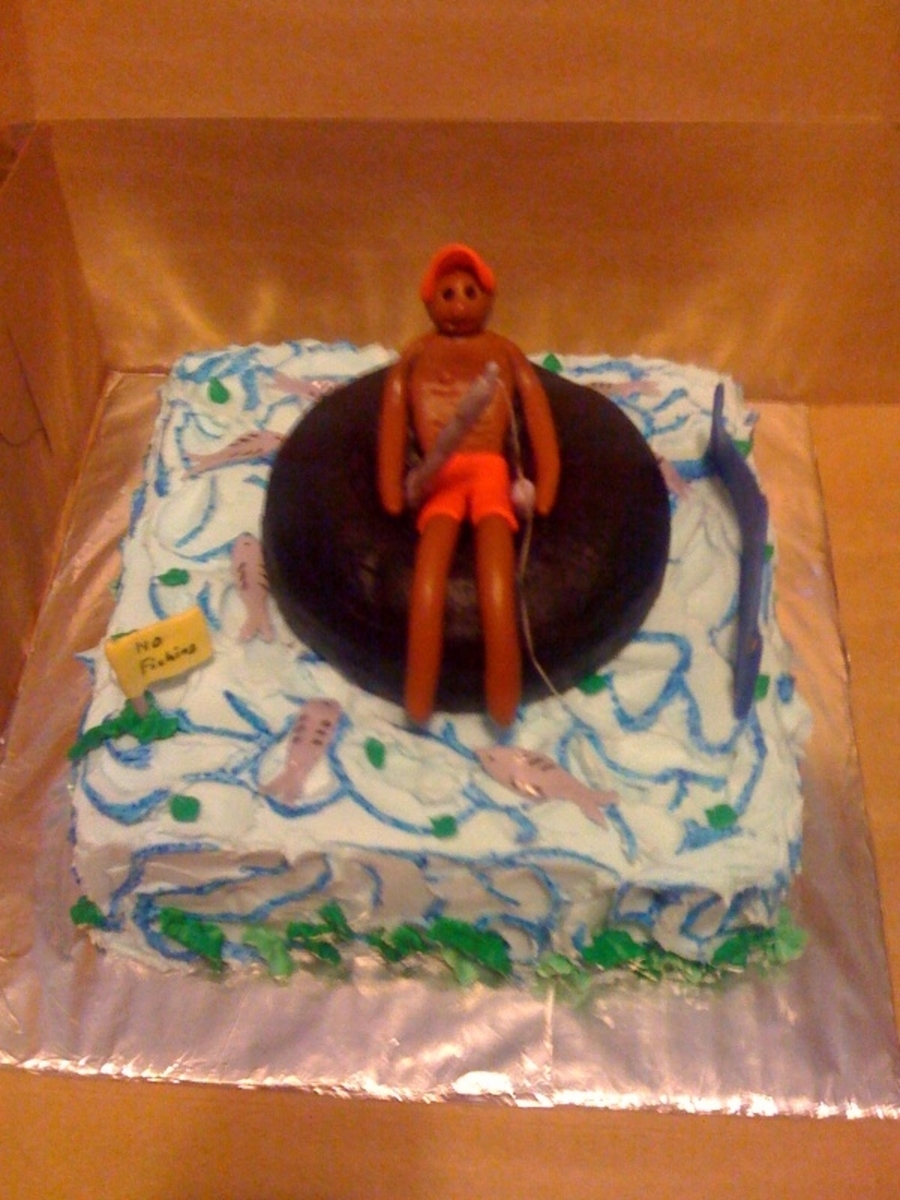60th birthday cake of fisherman on an innertube fishing on a lake. White cake and butter cream frosting, fisherman made of fondant.