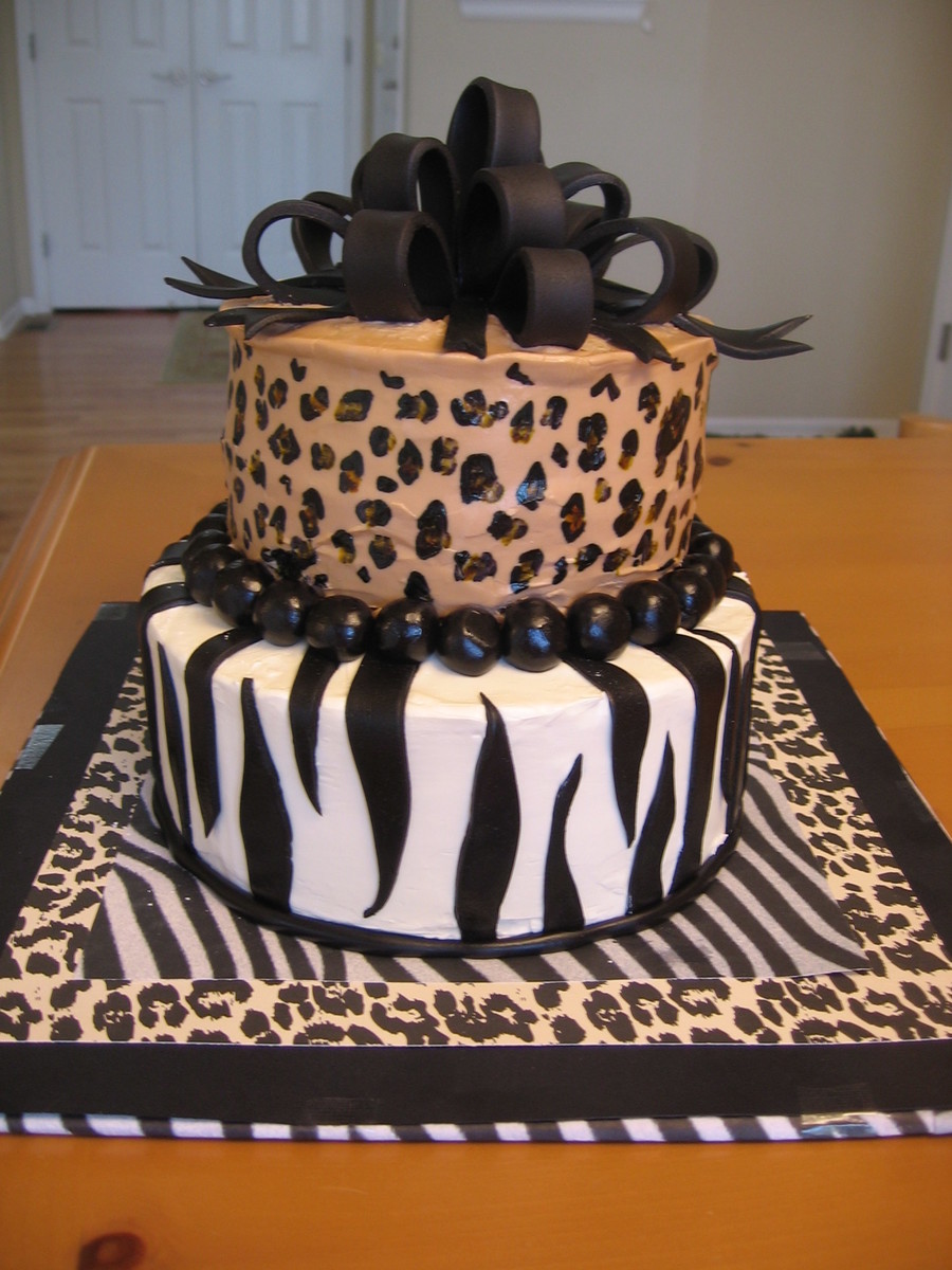 First attempt at fondant bow--DISASTER--too heavy-almost sank the ship!! But, overall cake turned out fine for my friend's birthday. Buttercream with fondant accents and painted on leopard print.
