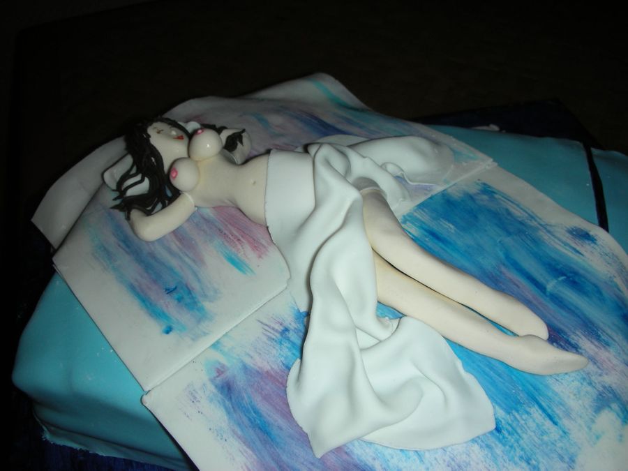 This is a carrot cake shaped out as a matress with blue sheets then white fondant pages (like a magazine) and a gumpaste playmate