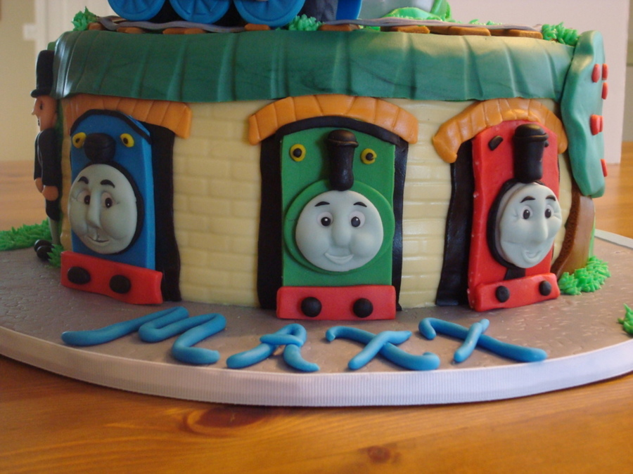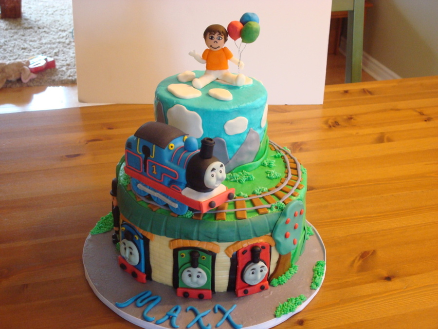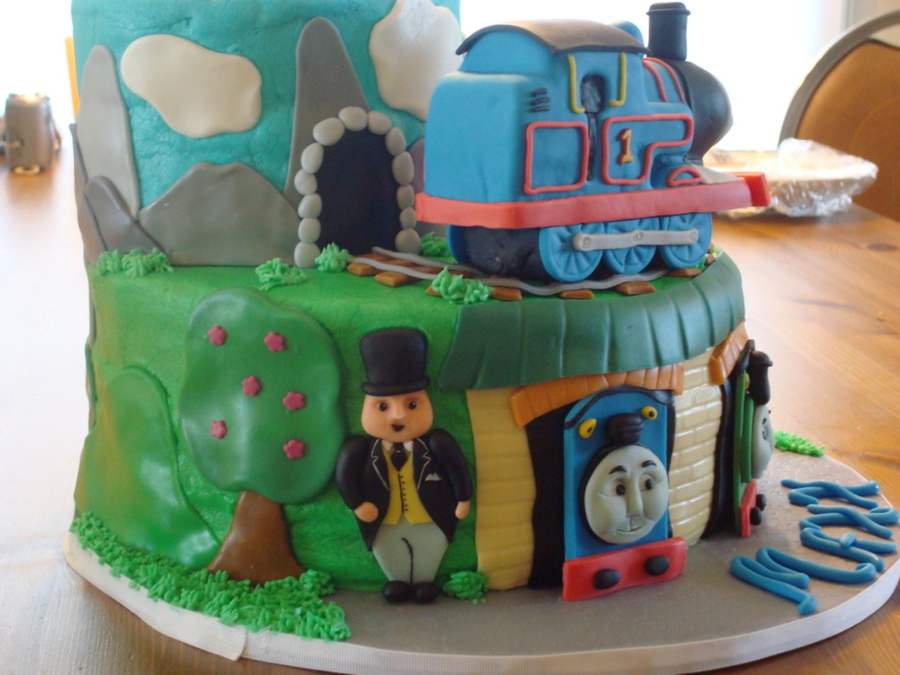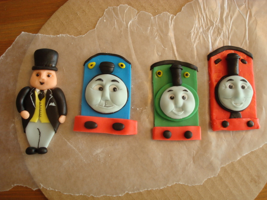 Hi all, made this for a boy who loves Thomas. It took wayyyyyy longer than I anticipated but I'm fairly happy with the result so I guess.... The character on top is made to look like his Mii character (from the Wii... had to ask on that one). Now for the details: BC with MMF and 50/50 accents. Thomas is carved RKT with MMF covering. Top layer is 6" vanilla WASC with cookies n' cream mousse filling, bottom is 10" chocolate fudge with ganache. Sir Topham, Gordon, James and Percy are all 50/50 gp/mmf. Thanks for taking a look! Oh and thank you to Melissa0902 for some inspiration.