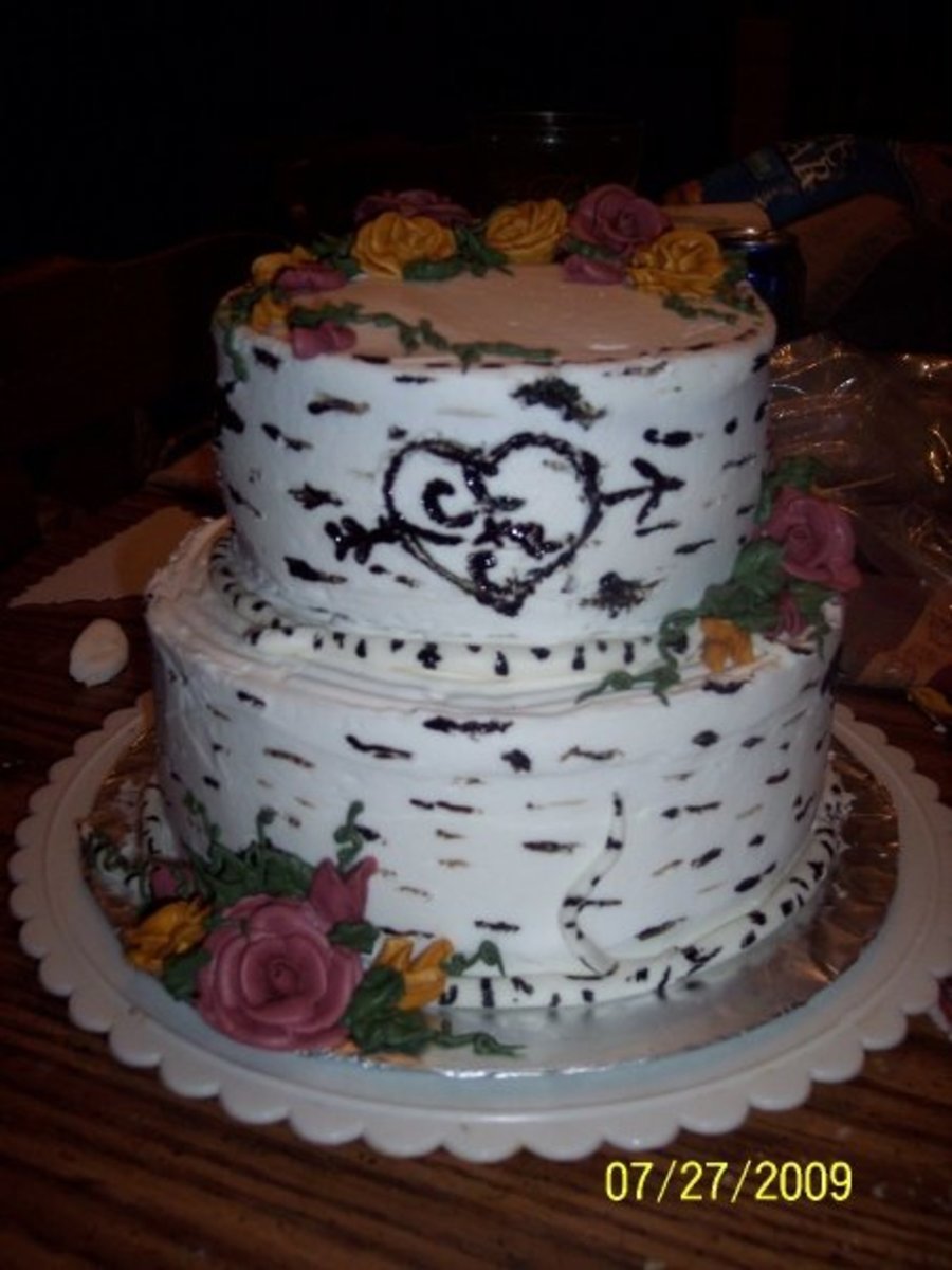 Cake I made for county fair. Won 2nd place! Made to look like birch or Aspen tree with me and my Hubby's initials carved in. iced in buttercream with buttercream roses and fondant borders made to look like branches