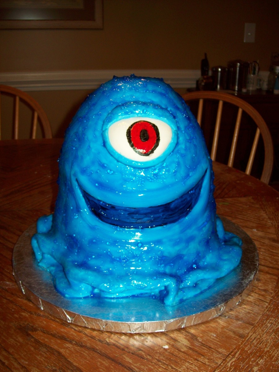 A friend and I worked on this cake. Vanilla cake (3-8" layers an a Wonder Mold layer) covered in blue MMF. Blue tinted piping gel slimed up the entire cake.