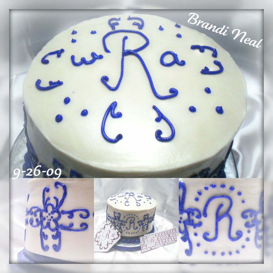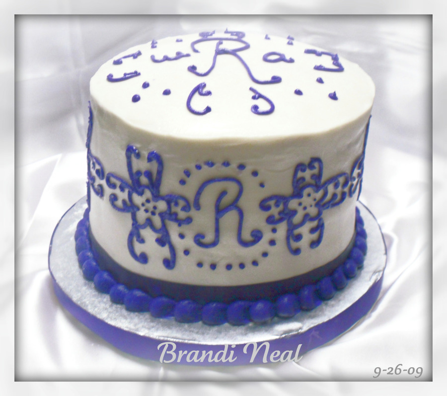 Scroll Work Bridal Shower 6" Round Chocolate Cake with Purple Buttercream Scrolls & Monogram to match invitations (Its actually a dark purple my camera made the color look different for some reason) I didn't like this cake at all, It was completely the brides design she wanted to match the invitations. I thought it was way to much for a 6" cake. But oh well!!