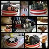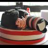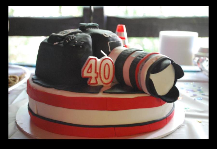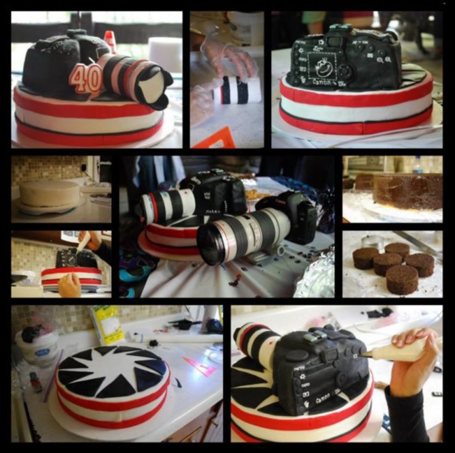 The "camera" was made in chocolate cake, the base was yellow cake, both covered with fondant with royal icing details.
